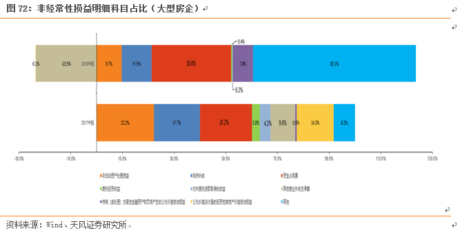 此外,小型房企的投资收益增速在四组房企中最快,达到766.8%,投资收益占净利润的比例在四组房企中第二高(仅次于中型房企),达到24.5%,这或许是因为中小型房企同其他开发商合作的项目中有很多没有并表。从投资收益的构成来看,小型房企的理财产品及基金投资收益和委托贷款及信托收益占比明显高于其他几组房企,这可能是因为小型房企实现销售回款之后不再大举投资拿地,因而进行了大量的财务投资。小型房企的非经常性损益占归母净利润的比例在四组房企中最高,达到24.9%,主要为“非流动资产处置损益”。可能是由于小型房企转让项目或者跟其他开发商合作开发的情况较多,也不排除部分是因为小型房企有更强的平滑业绩的需求。