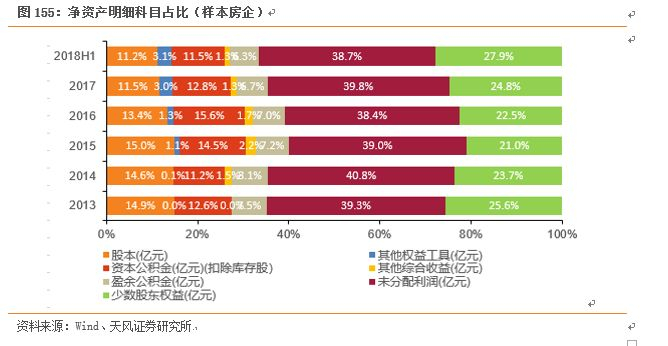 如果拆分44家样本房企净资产的详细结构,我们发现未分配利润占比最高,2018年半年报达到38.7%,其次为少数股东权益,达到27.9%,且近几年占比呈不断上升趋势。分组来看,中、小型房企的股本和资本公积占比明显高于其余两组房企,而龙头和大型房企的少数股东权益明显高于中小房企。