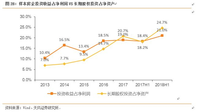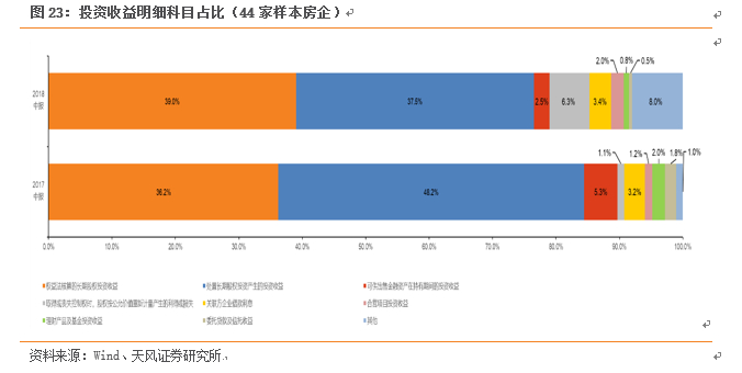 从44家样本房企投资收益占净利润的比例来看,近年来同长期股权投资占净资产的比例基本一致,但分组来看,中、小型房企投资收益占净利润的比例要更高一些,原因可能是由于中、小房企除了合作开发之外,还买了不少银行理财、基金等等。