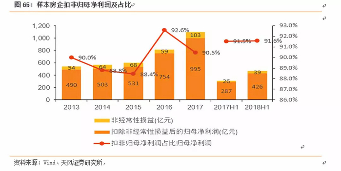 2018年上半年44家样本房企整体的扣非归母净利润占归母净利润的比例同去年同期基本持平,为91.6%。分组来看,小型房企下降较多,从96.9%下降到75.1%;龙头房企略有下降,由97.3%下降到95.3%。大、中型房企扣非净利润占比大幅上升,分别由2017年半年报的85.1%、70.9%提升至92.0%、85.0%。