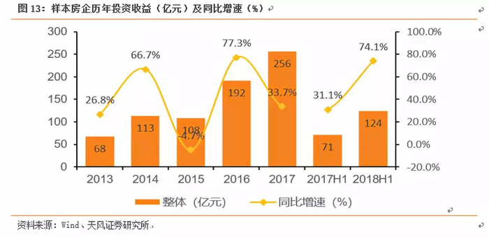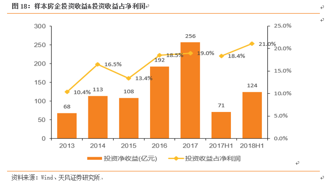 合作开发项目中自己没有并表的项目的利润体现在投资收益中。2018年上半年,44家样本房企投资收益占净利润的比例达到21.0%,同少数股东损益占净利润的比例基本一样。中、小型房企占比较高,分别达到26.8%和24.5%,这或许是因为中小型房企同其他开发商合作的项目中有很多没有并表。大型房企占比最低,仅为14.1%,这或许是因为大型房企对规模迅速扩张的渴求更为强烈,因而在合作开发的时候要求并表的项目更多。