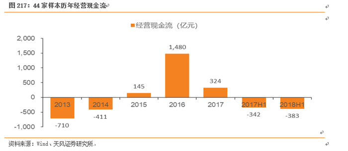 2017年44家样本房企经营现金流实现净流入324亿元,虽然较2016年大幅回落,但依然是近五年除2016年外表现最好的一年。2018年上半年,样本房企经营现金流转负,净流出383亿元,这可能是与房企集中在年初拿地,而年初推盘量相对较少有关。