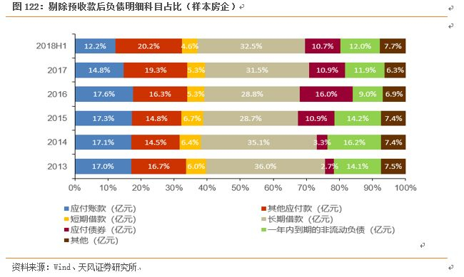 如果剔除掉预收款之后再来看房企的负债结构,我们发现占比最大的是长期借款(占剔除预收款后总负债的21.1%),其次为其他应付款(占剔除预收款后总负债的13.2%),其他应付款占比近年来呈不断上升趋势,这可能是因为合作开发项目不断增多所致,并表项目公司获得的少数股东借款一般记入其他应付款当中,其中既包括真实合作开发的房地产企业,也包括明股实债形式投资入股的信托公司等。此外,与合作方共同开发项目的过程中,项目形成销售回款后各股东方可能会按持股比例将富余资金拆回。对于没有合并报表的一方而言,自己提前拆回的资金也记入了其他应付款。