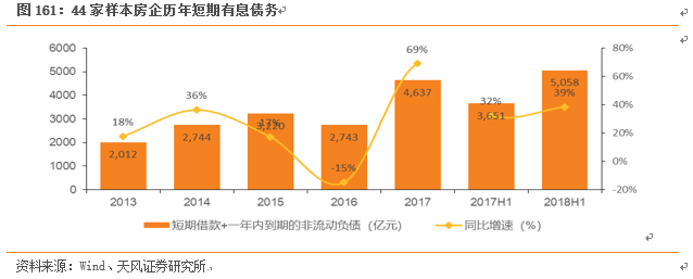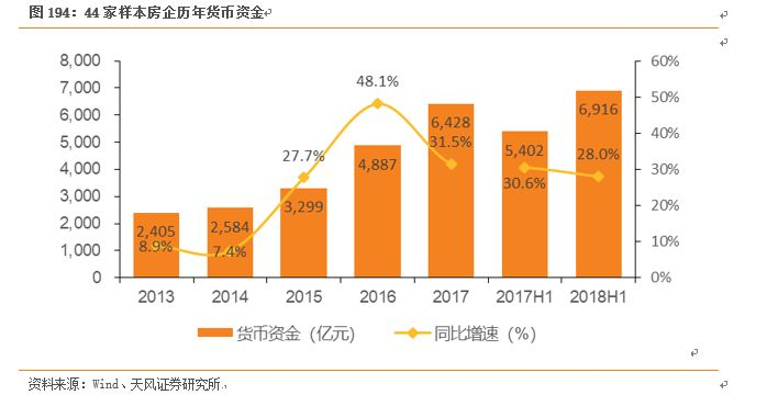 我们发现从44家样本房企整体来看,房企在手现金充沛,2018年上半年尽管在房企融资环境不断趋紧的大环境下,样本房企账面货币资金仍较2017年底有所上涨,并且较去年同期增长了28.0%,账面货币资金规模创近五年新高。