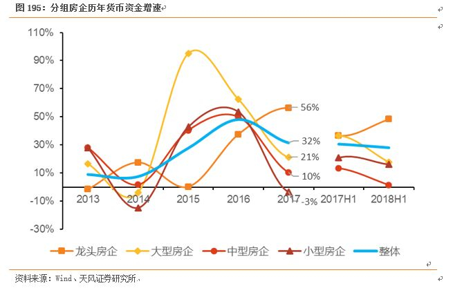 分组来看,18年上半年,龙头房企和大型房企筹资活动现金流依然维持大规模净流入,但增速出现分化,较去年同期分别增长142.39%和下降29.57%;而中型房企筹资活动现金流转负,小型房企筹资现金净流入规模仅为去年同期的9%。筹资的行业集中度提升趋势非常明显。