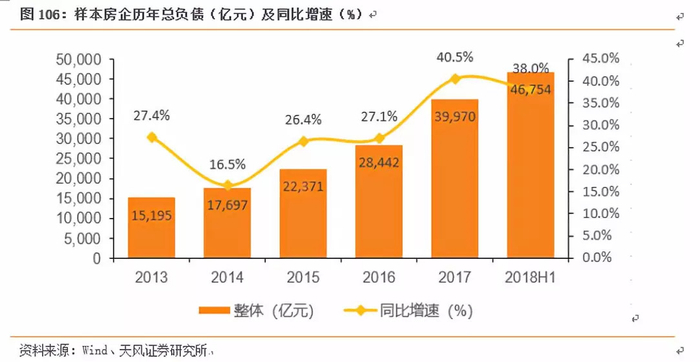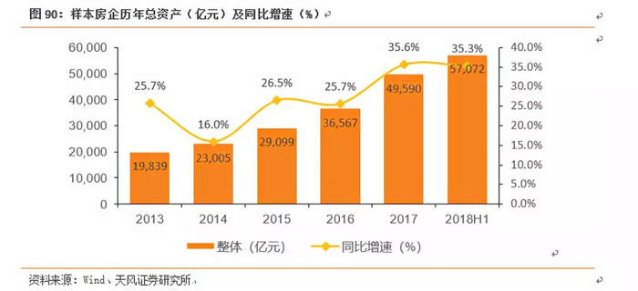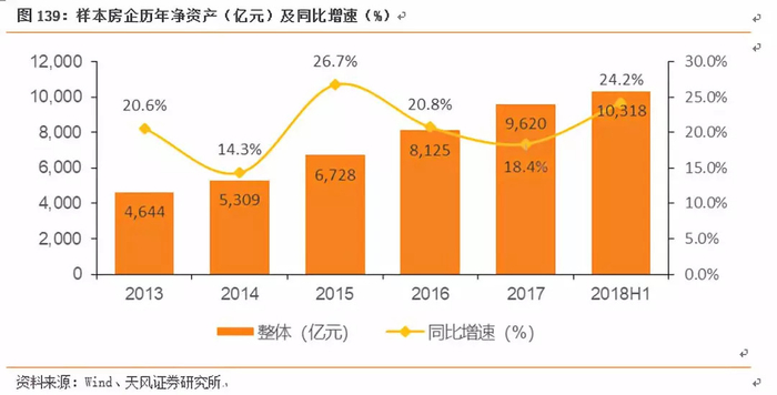 44家样本房企净资产规模不断扩张,2018年上半年总规模达到10318亿元,同比增长24.2%。其中龙头房企和大型房企增速最快,分别达到27.1%和28.2%;中、小型房企增速稍慢,分别为15.4%和11.3%。