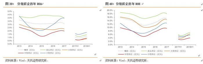 动态来看,小型房企净利润率提升最为明显,从2017年上半年的14.4%提升到2018年上半年的18.3%,提升了3.9个百分点;其次为中型房企,从2017年上半年的8.4%提升至2018年上半年的11.0%(提升了2.7pct);大型房企和龙头房企则分别只提升了2.2和2.0个百分点。