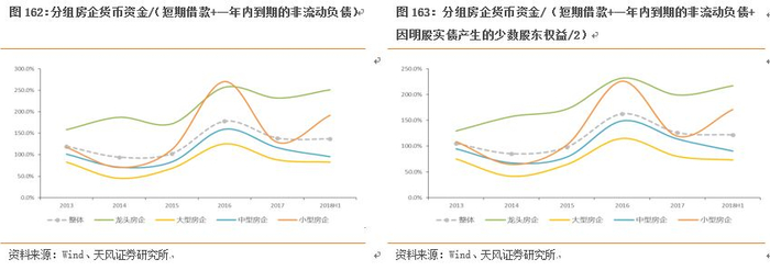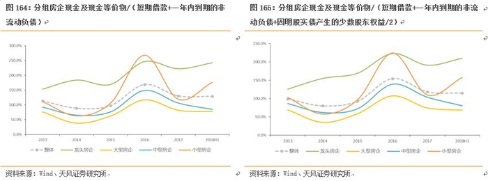 由于房企流动负债中包含大量不需要货币来偿还的预收款(实际上是用存货偿还),因此我们用“短期借款+一年内到期的非流动负债”来测度“短期有息债务”可能能更好地反应房企的短期偿债压力。