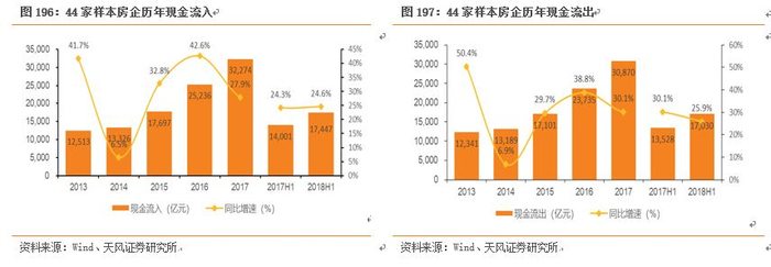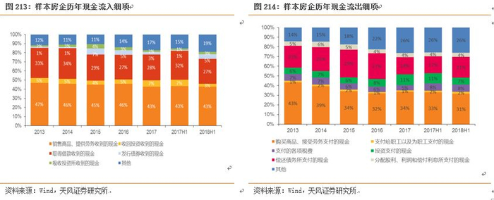 我们仔细拆分了44家房企现金流入和现金流出的构成。发现销售回款和借贷是最主要的两大现金流入来源,2018年上半年两者合计占比达到70%;拿地施工和偿还债务是现金流出的主要方向,两者合计占比达到52%。