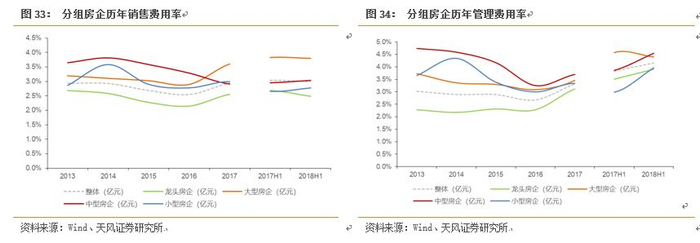 但各组房企的管理费用率多数大幅提高(大型房企除外)。44家样本房企的管理费用率从2017年上半年的3.82%提升至2018年上半年的4.15%,提升了0.34个百分点;小、中型房企提高较为明显,分别提升了0.98和0.69个百分点;龙头房企提升了0.40个百分点;大型房企管理费用率下降了0.18个百分点。静态来看,龙头房企和小型房企的管理费用率最低,分别为3.91%和3.96%;大、中型房企的管理费用率则偏高,分别为4.40%和4.55%。