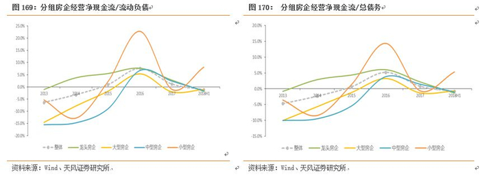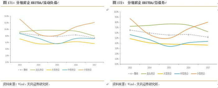 如果用经营现金流/总债务、经营现金流/流动负债、EBITDA/总债务、EBITDA/流动负债等指标来测度房企的偿债能力,我们发现小型房企的表现也都是最好的,大型房企表现最差。这可能是因为大型房企还处于杠杆扩张期,实现销售回款之后要投入很大部分资金用于拿地。