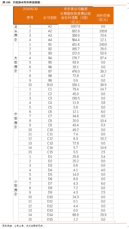 房企所占非并表子公司的净资产体现在合并报表中的长期股权投资当中,但是我们无法看到非并表子公司详细的负债结构。这种情况下我们可以用两种方法来估计非并表子公司的融资规模(包括明股实债和正常的债性融资):(1)用长期股权投资乘以一个综合的杠杆倍数估算(2)参考对外担保的金额