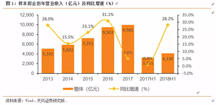 2018年上半年,44家样本房企营业收入同比增长28.2%,受益于行业集中度提升,龙头房企和大型房企规模扩张较快,收入规模分别同比增长28.9%和48.7%,中型房企和小型房企则几乎没有增长,同比增速分别为5.4%和1.1%。