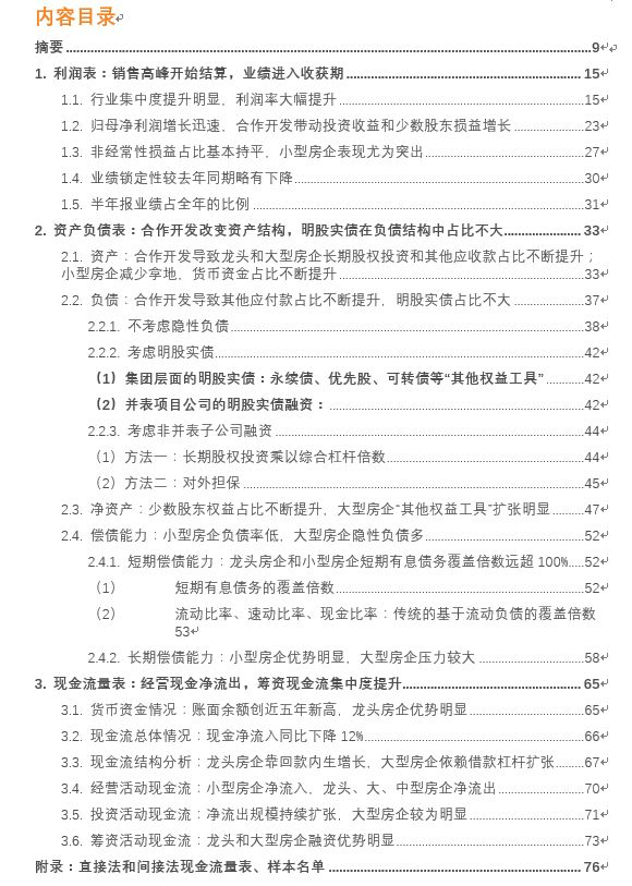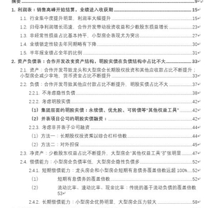 我们通过深度分析房企三张表,发现小型房企不再大举拿地,业绩增长最慢,负债率最低,经营现金流表现最好;龙头房企靠回款内生增长,很好地平衡了规模增速与利润率,负债率第二低,短期偿债能力最强,筹资现金流表现最好;大型房企业绩增速最快,利润率最低,费用率最高,负债率最高。我们估算了房企明股实债的规模,发现明股实债仅仅是一种补充的融资方式,占比不到5%,但大型房企占比较高,达到7.3%;我们估算了房企非并表子公司负债的规模,发现除了龙头房企较多之外,其他几组房企规模不大。从货币资金对一年内到期债务的覆盖能力来看,龙头房企和小型房企短期偿债能力较强,大、中型房企中部分房企短期偿债压力较大。