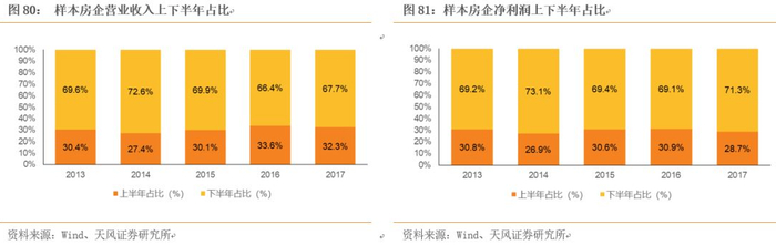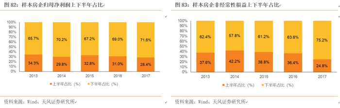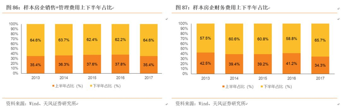 从房企经营业绩释放的节奏来看,历年来利润表各项指标下半年结算的比例远远大于上半年。以2017年为例,上半年营业收入占全年的比例仅为32.3%,净利润占比为28.7%,归母净利润28.4%,均不及1/3。费用结算的节奏稍微均匀一些,但2017年上半年占全年的比例也仅仅略微超过1/3,销售费用33.4%,管理费用37.2%,财务费用34.3%。
