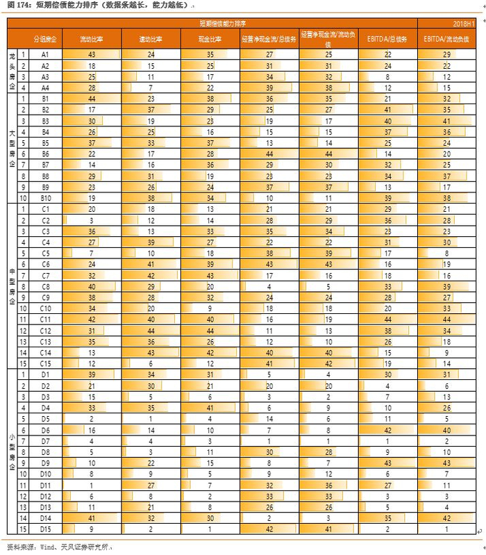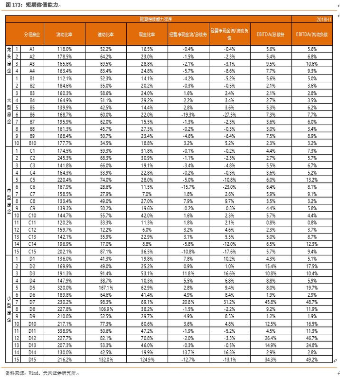 (1)短期偿债能力:龙头房企和小型房企短期有息债务覆盖倍数远超100%