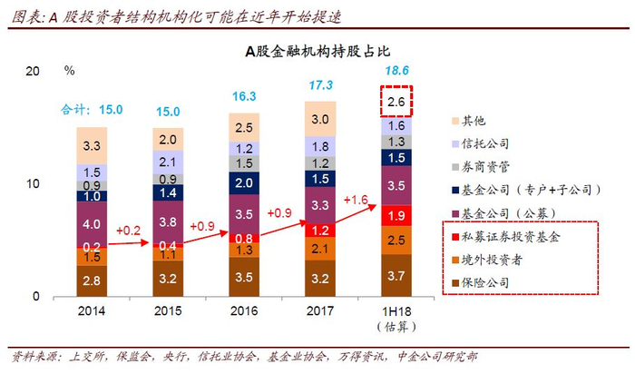 目前,二级市场私募可能是A股规模第四大的投资机构类别,占比达~12%。根据我们的测算,A股金融机构持股占比可能已经从2014年的15.0%提升至2018上半年的18.6%。对持股占比提升贡献最大的三个机构分别是二级市场私募(1.6%)、海外投资者(1.0%)、保险机构(1.0%)。往前看,随着国内机构投资者的逐步壮大,海外投资者的不断渗透,以及养老金等长线投资者进入市场,A股市场投资者结构机构化的程度有望进一步提升,缩小与美国、英国等成熟股票市场的差距。