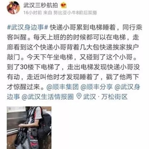 站在电梯里睡着了据拍摄这张照片的网友介绍,自己在汉口万松街一大厦内上班,平时经常遇到顺丰的一位快递小哥,每次都是背着几大包快递,挨家挨户去敲门送件。