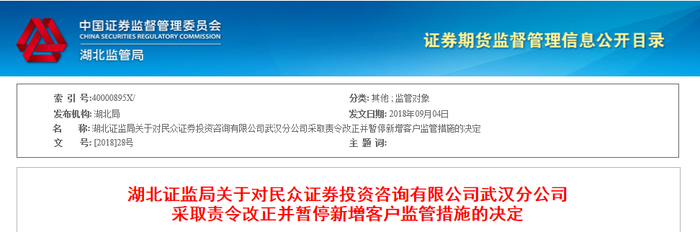 新浪财经讯 9月17日,民众证券投资咨询有限公司武汉分公司因内部控制不完善、部分客户进行风险揭示不完善等多项违规行为,被湖北证监局责令予以改正并暂停新增客户。