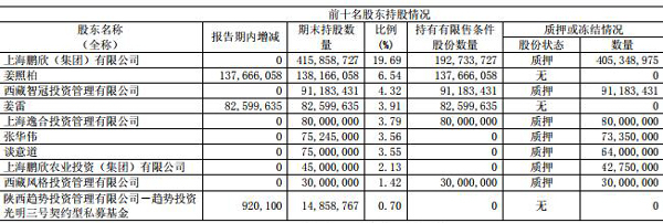 上海鹏欣(集团)有限公司持股数量为4.16亿股,质押股份数量为4.05亿股;西藏智冠投资管理有限公司持股数量为9118.34万股,所持股份全部质押;上海逸合投资管理有限公司持股数量为8000万股,所持股份全部质押;张华伟持股数量为7524.50万股,质押股份数量为7335万股;谈意道持股数量为7500万股,质押股份数量为6400万股;上海鹏欣农业投资(集团)有限公司持股数量为4500万股,质押股份数量为4275万股;西藏风格投资管理有限公司持股数量为3000万股,所持股份全部质押。