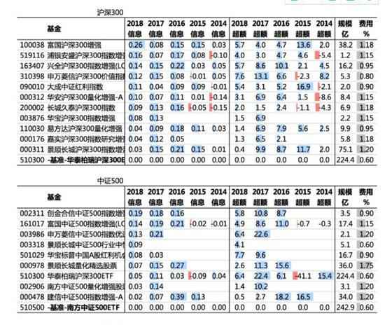 通过对比过去5年中,指数增强基金相对基准基金的超额收益和信息比率,可以帮助我们更好地挑选指数增强基金
