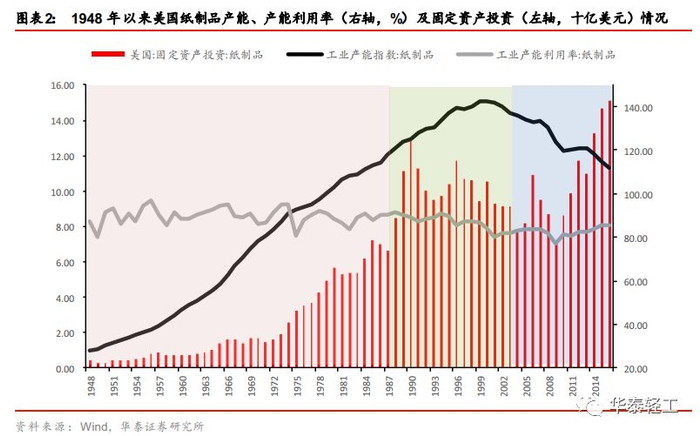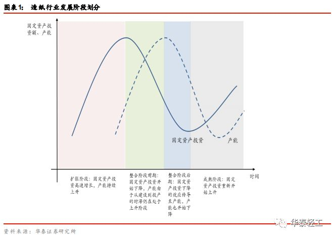根据固定资产投资和产能之间的关系将造纸行业的发展分为三个阶段:固定资产投资额和产能齐升的扩张阶段、固定资产投资额下降产能上升的整合阶段以及固定资产投资和产能同时下降的成熟阶段。