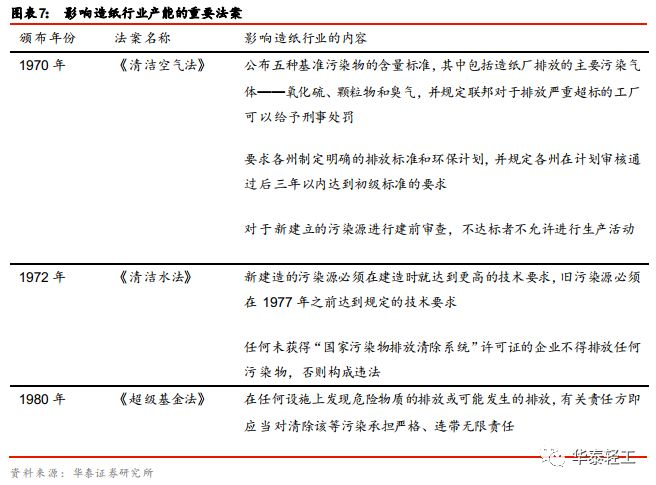 去产能前期:中小企业遭到淘汰,龙头企业经历阵痛。1970年-1980年“环境立法十年”开启了美国造纸行业的去产能过程。这十年间出台的一系列法律相较于之前的文件法规目标更加明确、规定更加严格且执行力度更强,其中对造纸行业影响最深的是1970年出台的《清洁空气法》和1972年出台的《清洁水法》。前者限定了造纸厂所排放的污染气体在空气中的含量标准;后者制定了“国家污染物排放清除系统”,对所有工厂进行环保审查并发放排污许可证,同时对工业企业的污染控制技术提出了更高的要求。