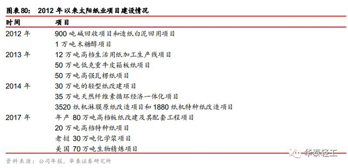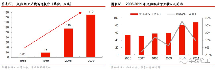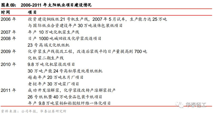 把握时机逆势扩张,产能规模持续扩大。在前期低成本扩张下公司产能规模快速扩大,2006年纸产能达到116万吨。为缓解原材料价格上涨的压力,公司于2007年开始建设木浆生产线,发挥自制木浆生产优势,进一步提高公司在高端文化用纸国内市场的占有率。2008年在全球金融危机影响下,太阳纸业依靠高效的经营效率,稳步实施各项战略,在行业低谷时主动把握时机扩张产能、及时优化产品结构,又一次通过低成本投资筹建了23号、24号纸机,并实施化学浆生产线技改及碱回收工程,进行化机浆项目、热电联产背压汽轮发电项目等项目的建设。2006-2011年间公司产能建设有序推进,为业绩增长提供了有力支撑,营收规模由55亿元提升至84亿元。