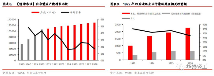 环保法令的颁布一方面导致了行业内大量落后产能的淘汰,另一方面增加了新产能的建造成本。行业整体产能扩张速度减缓,“环境立法十年”期间行业产能年复合增长率仅2.4%,并在1990年以后下降到不到2%,相较“立法十年”之前年均4%的产能增长,扩张速度明显放缓。污染控制投资额在新产能投资中的占比上升,在1972年以后达到30%左右。得益于中小产能的淘汰,行业集中度在这一时期有所提升,CR4由1972年的24%提升至1984年的28%。同时,环保政策导致的停机减产在纸价上也有所反应,70年代纸价上涨明显,到1976年纸价几乎是1961年的两倍。