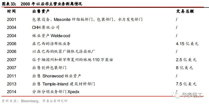 规避单一业务风险,尝试多元化发展。1960年-1970年间,木浆及纸制品业务的营收占比一度达到85%,为规避业务单一的风险,公司在70年代开始进行经营业务的多元化尝试,公司业务曾拓展至住房建造、非纺织物、纸巾、尿布及木制品领域,但新业务与原业务协同程度不佳,业绩反响平平。1990年后期,由于纸制品市场行情恶化,公司制定了成本压缩计划并开始剥离一些经营状况欠佳的业务,如影像产品、非纺织业务等。
