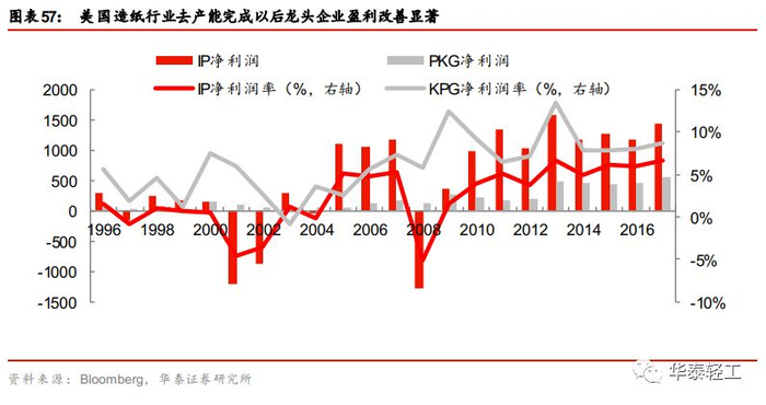 去产能完成后龙头企业将获利好。参照美国造纸行业的发展,龙头企业在去产能过程完成以后盈利情况均有明显改善。国际纸业和美国包装公司的净利润和净利率在2004年以后提升明显,国际纸业除08年以外没有出现过净亏损情况,且净利率基本保持在5%左右;美国包装公司在2004以后净利润全部为正,净利率均在5%以上。对比90年代,龙头企业的盈利能力和盈利稳定性均有提升。
