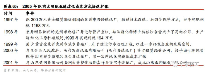 以低成本方式实现规模快速扩张。1997年太阳纸业低成本收购兖州市兴隆造纸厂后通过技术改造获得了高额回报,坚定了公司走低成本扩张之路的信心。此后,太阳纸业充分利用自身的技术、资金、管理和规模优势,通过节省投资和对资源的高效利用,打出了一系列低成本扩张的“组合拳”,相继对兖州市地毯厂、兖州市淡水养殖厂、鱼台县造纸厂等多家企业进行兼并重组、租赁收购或技术入股,实现规模快速扩张。据太阳纸业在《造纸信息》所发布信息显示,截至1999年,太阳纸业已由成立初期年产量仅500吨、年销售收入30万元的小型纸厂迅速成长为年产量达到19万吨、销售收入7.8亿元的全国领先纸企。