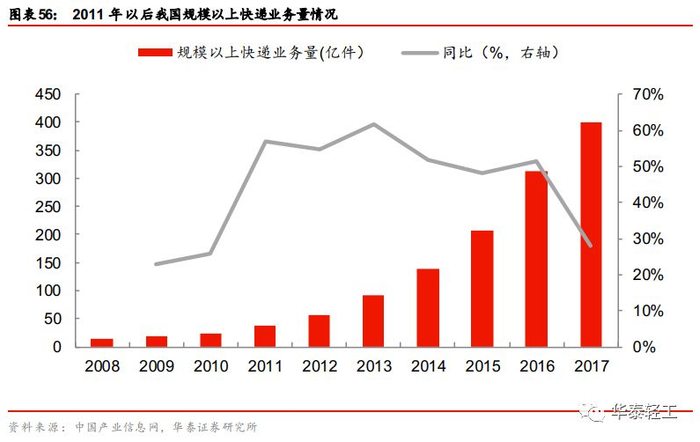 电商市场高速增长,拉动包装纸需求量大增。我国的电子商务的快速发展衍生出了快递行业的迅速崛起, 2011 年以来我国快递业务量出现“井喷式增长”,2011-2016年间规模以上快递量同比增速持续维持在45%以上,尽管2017年快递业务增速有所下滑,但仍维持了25%以上增速。快递业务的发展对包装纸,特别是箱版瓦楞纸的需求起到了明显的拉动作用。