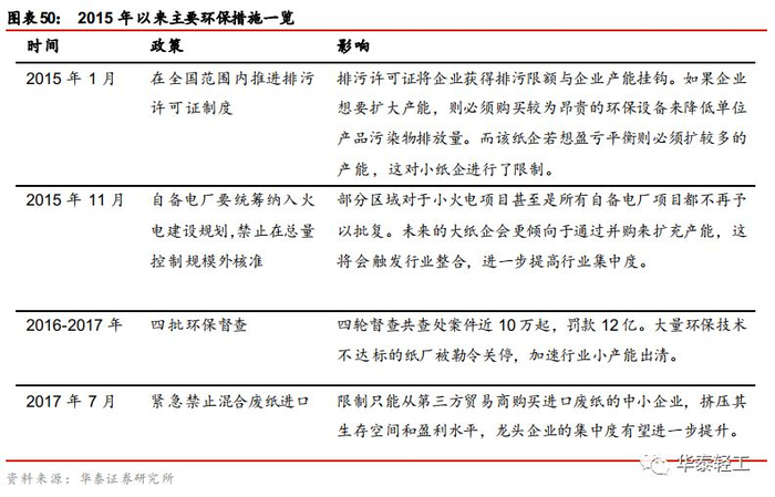 环保趋严加速落后产能出清,龙头企业受益明显,行业集中度有望进一步提升,持续看好造纸龙头。受益标的包括山鹰纸业(箱板瓦楞纸龙头,受益外废进口限制带来成本优势以及供给侧改革带来的集中度提升)、太阳纸业(浆纸系龙头,周期与成长属性兼备)。