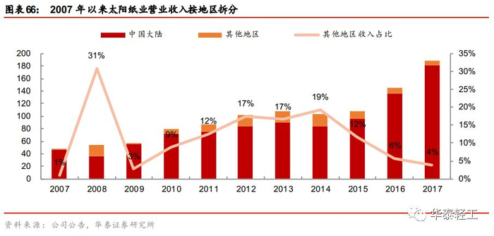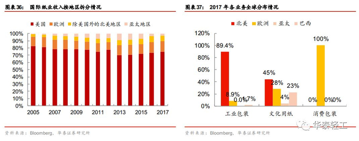 整合全球布局,强化地区业务定位。2005年以后公司开始对各项业务进行针对性布局,2017年美国、欧洲、除美国以外的美洲地区以及亚太地区收入占比分别为75%、14%、8%、3%。细分业务看,2017年工业包装业务主要集中于北美地区,文化用纸则有一半以上的营收由北美以外的地区贡献,消费包装业务目前仅在欧洲地区开展。