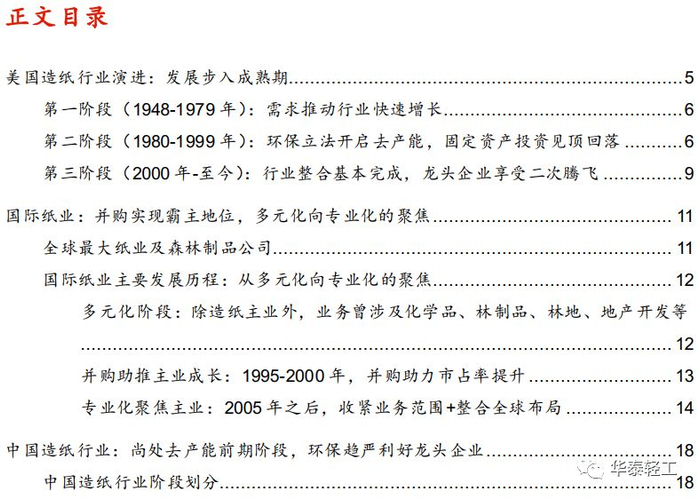 美国造纸行业的发展大致分为三个阶段:20世纪70年代以前的高速扩张时期、20世纪80年代至2000年的去产能整合时期以及2000年以后的成熟时期。