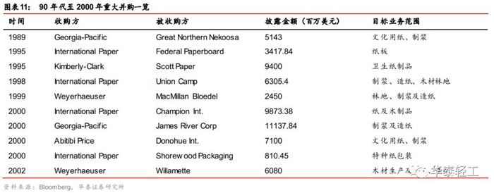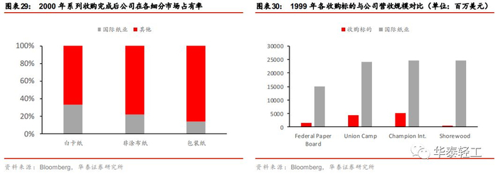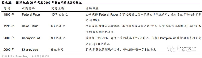 1995年至2000年之间国际纸业共进行大小并购14次,并购对象多为细分行业龙头或同业竞争对手。1995年公司收购包装纸板生产商Federal PaperBoard,收购完成后公司在白卡纸市场的占有率达到33%。1998年公司以63亿美元的价格收购本土造纸巨头Union Camp,并购完成后公司在美国非涂面纸的市场占比上升至22%,公司从而超过竞争对手乔治亚-太平洋公司(13%)成为美国第一大非涂面纸生产商;在包装纸板业务的市场占有率也由7%提升至14%。2000年4月公司宣布将以每股64美元的价格收购Champion Int,并表带来的营收规模提升在20%以上,每年可节约成本达到4.25亿美元。2000年3月公司收购零售包装龙头企业Shorewood,意在增强消费包装业务下的零售包装部门。