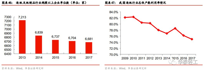 2014年至今:产能扩张放缓+环保趋严开启去产能过程。2014年以后,固定资产投资和行业总产能都逐渐企稳,两者在2014-2015年间都仅增长1%。同时,14年以后环保政策趋严,15年自备电厂纳入火电建设规划,16年国务院发布《控制污染物排放许可制实施方案》,17年推出《排污许可证管理暂行规定》并开启四轮环保督查行动等。由于市场空间有限且纸价稳定,小产能在量价上都无法取得优势,再叠加环保政策趋严,部分规模较小的小产能被迫退出市场,规模在2000万以上的企业数在这一时期以平均每年200家的速度减少,行业产能利用率略有回升。