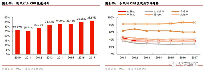 我国目前仍处于去产能过程的前段,具体表现为:1)行业总产能仍在不断增加,只是增速有所减缓。随着环保力度不断加大、去产能持续进行,行业内淘汰的多为中小产能,而大企业则仍在进行产能扩张。山鹰纸业产能由2012年的250万吨增加至2017年的358万吨、太阳纸业产能也有2012年的400万吨增至2017年的452万吨。2)行业集中度低且提升缓慢,市场格局还未最终奠定。除白卡纸和双铜纸以外,其他主要纸种的CR4均在45%以下,产能集中度仍然较低。美国造纸行业去产能完成以后CR10维持在80%以上,这说明我国造纸行业集中度仍有提升空间,市场格局还未最终奠定。