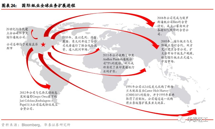 国际产能扩张,布局全球市场。五十年代晚期,公司开始将业务向海外发展,出口量在伦敦、巴黎、苏黎世、约翰内斯堡等城市居于前列。1959年,在以色列、德国、希腊、意大利开设了分公司或者进行了联合风险投资。60年代在欧洲兼并了大量生产集装箱的厂家,包括意大利的Catania,西班牙的Bilbao,法国的Arles 和 Mortagne等,公司在欧洲市场的影响力增强。90年代以后,国际纸业加快了扩张步伐,在1989-1990年收购了4家欧洲纸业公司,其中包括乔治亚-太平洋公司的法国分部、德国涂料纸巨头ZandersFeinpa— piere AG和法国的Aussedat Ray。1991年公司以2.6亿美元收购了新西兰木制品巨头Carter HoltHarvey (CHH)16%的股份,并于1995年最终取得了控制权,公司通过这一收购将业务版图扩展至亚太地区。