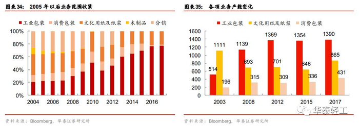 2005年以后行业迈入成熟阶段,市场格局奠定,各龙头企业竞争策略由向外扩张,提升产能转向内部整合,增强盈利。国际纸业在这一阶段的发展战略主要分为两方面:对内收紧业务范围,聚焦造纸主业;对外整合全球布局,提升公司竞争力。