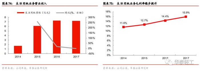 布局生活用纸,打开发展空间。根据“四三三”发展战略,公司自2013年底成立子公司从事生活用纸运营,目前总产能为12万吨。2015年公司创新性推出“无添加”系列生活用纸,迅速得到消费者认可,打开市场销路;2016年公司与日本制纸Crecia股份公司签署纸尿裤生意战略合作伙伴协议,在中国市场推出Suyappy (舒芽奇)系列儿童纸尿裤,进一步打开企业发展空间。2017年公司生活用纸业务实现营收7.2亿元,毛利率同比提升1.6个百分点至15.9%。