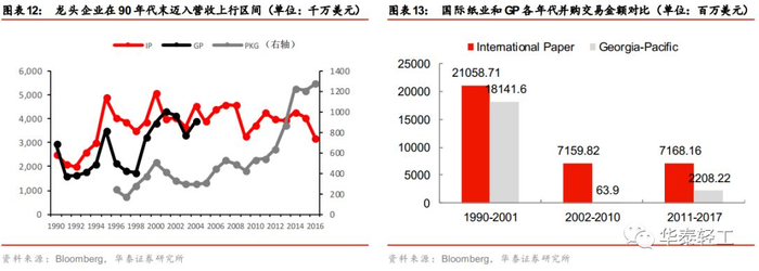 去产能后期:龙头企业并购提升市占率,营收迈入上行区间。行业内的落后产能在1980年到2000年之间加速出清,据Bloomberg数据,1980-2000年间产能CAGR下降至1.9%,单年增长率于2000年降至约0%。纸厂数量在1967年至1997年间由351家减少至220家,大量中小企业遭到淘汰,行业由此开始了长达近10年的整合时期。龙头企业如国际纸业、乔治亚-太平洋公司等均在这一时期大规模扩张并购,抢占市场份额。