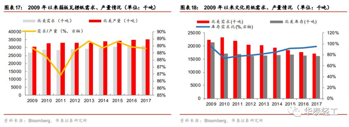 内部整合完成,行业供需企稳。2000年以后,落后的中小产能产能逐渐淘汰殆尽,市场格局在这一时期逐渐形成,2001年以后CR4维稳在50%左右,CR10均保持在80%以上。固定资产投资和产能利用率除2008年前后受到金融危机影响有所下跌以外,其余时间都保持了增长趋势,固定资产投资额到2013年已经恢复至1990年的水平,产能利用率在2016年重新达到85%以上。纸制品产量和需求趋于稳定,箱板瓦楞纸的产量和需求年增速维持在2%,需求产量比稳定在88%左右,文化用纸由于受到无纸化办公和电子替代品的冲击产量和需求逐年小幅下滑,但库存需求比一直维持在80%左右。