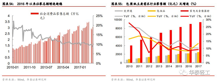 国内社零增长稳定,包装纸传统需求不减。零售业是包装纸的下游产业,我国的社会零售额增速从2011年的17%左右的累计增速逐渐回落,2016 、2017年全年我国社会零售额增速均在10%左右,增速已经趋于稳定。具体来看,包装纸的主要需求行业食品饮料、日化用品及家电等零售规模增速也逐渐企稳,2014年以来同比增速普遍保持在10%左右。