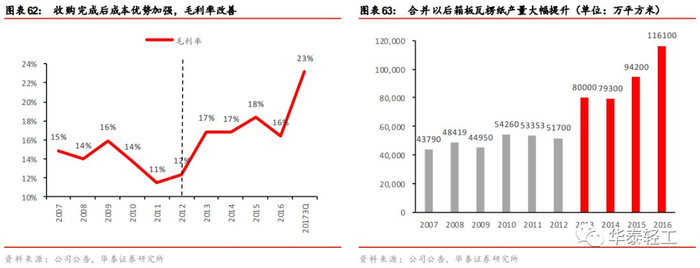 市场份额提升,规模效应显著。吉安集团在2011年产量69.62万吨,排在行业第六位,通过此次并购,合并后上市公司从一家地区性的造纸企业变为跨地区的全国性造纸企业,生产基地将扩大到安徽、江苏、浙江、福建、天津、安徽、湖北、重庆、四川等多地,造纸生产能力从100万吨提升至225万吨,纸箱生产能力将从6亿平方米提升至10亿平方米,产品市场占有率大幅提高,在包装纸行业产能排名升至第三,内资包装纸产能排名第一。产业链打通+规模提升带来双重利好,公司抵御风险的能力明显增强。