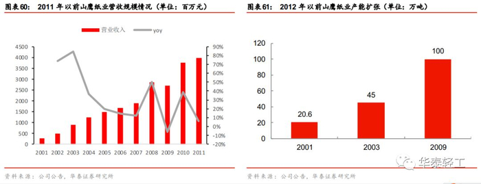 2010年以前为我国造纸行业的高速发展时期,山鹰纸业在这一时期内的发展战略主要为扩大产能,增加市场份额。公司2001年上市以后,多次募集资金持续扩充产能。在2001年至2011年的11年内,公司共募集资金5次,募得资金总额108亿,新增产能共计419.5万吨。公司营业收入在这一时期高速增长,2001-2011年期间营收年复合增长率达到30%;由于行业趋势向上,公司在这一时期盈利情况较好,除2008年受到世界经济危机影响以外,其他年份的净利率基本保持在3%以上。