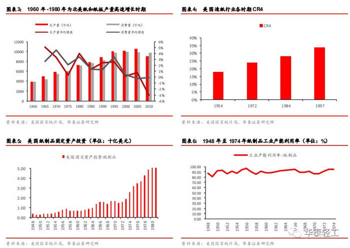 固定资产投资高速增长,对应该时期行业较为分散。美国造纸行业固定资产投资额在这一时期增长迅速,投资额由1948年的4亿美元增长至1980年的57亿美元,期间每隔约十年发生一次投资额小规模回调,但总体增长趋势强劲,CAGR达到8%以上。固定资产投资高速增长导致了行业产能的不断增加,但受益于需求旺盛,该时期行业产能利用率常年维持在85%以上高位。产能的扩张使得行业集中度维持在较低水平, 1954-1972年近20年间,美国造纸行业CR4区间为18%~24%。