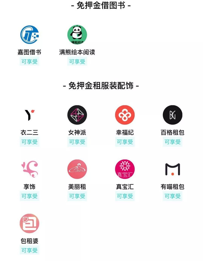 除了这个免费试穿、先享后付的服务之外,还有免押金、签证申请等其他的信用服务。