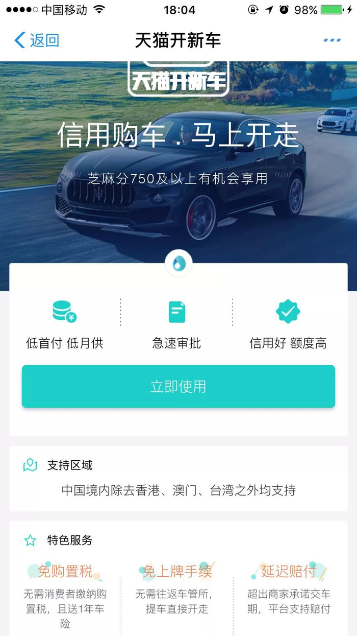 进入芝麻信用消费金融服务的“天猫开新车”,就可以申请。